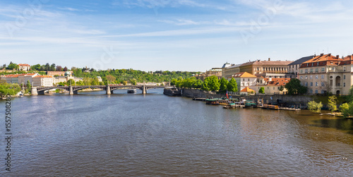 © Dreamnordno, Fototapeta premium Panoramic view of Prague with Vltava River and historic bridges
