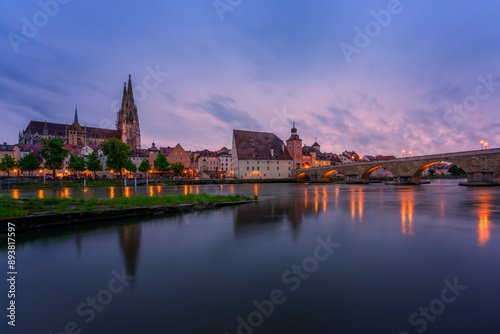© Bernhard, Fototapeta premium Panoramic view of Regensburg's old town on the Danube in Germany.