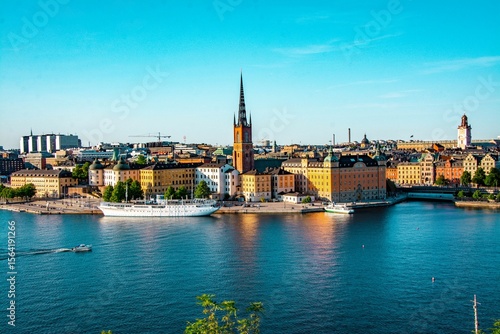 © Wirestock, Fototapeta premium Panoramic view of Riddarholmen church and Stockholm's historic architecture and waterfront
