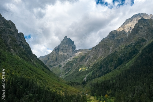 Fototapeta premium Panoramic view of river Malaya Laba valley with mountain ranges on sides, sharp peak Igolchatiy; morning landscape, dramatic cloudy sky, deep pine fir forest; danger narrow gully, steep gradient