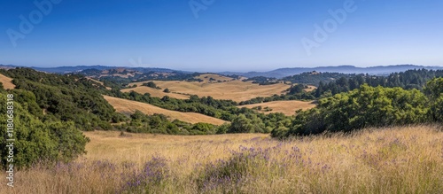 Naklejka premium Panoramic view of rolling hills, meadows, and distant mountains under a clear...