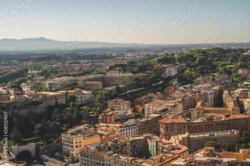 Fototapeta premium Panoramic view of Rome from the top of St Peter's Basilica roof. Famous touristic european attraction. Italy, Europe