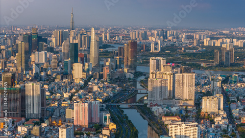 © CravenA, Fototapeta premium Panoramic view of Saigon, Vietnam from above at Ho Chi Minh City's central business district. Cityscape and many buildings, local houses, rivers. Landscape concept.