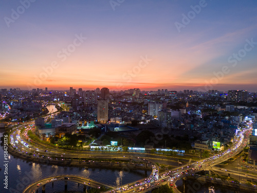 Fototapeta premium Panoramic view of Saigon, Vietnam from above at Ho Chi Minh City's central business district. Cityscape and many buildings, local houses, rivers. Landscape concept.