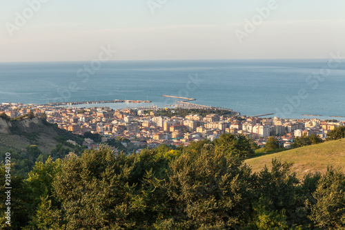 Fototapeta premium Panoramic view of San Benedetto del Tronto city in the sunset light. Holiday...
