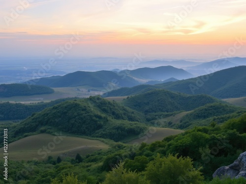 © AiGallery, Obraz premium Panoramic view of serene landscape at dawn, serene landscape, valley