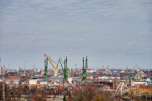 Fototapeta premium Panoramic view of shipyard with port cranes, industrial buildings and harbor...