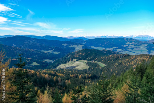 © Chris, Fototapeta premium Panoramic view of snow capped mountain ridges of Woelzer Tauern seen from Grebenzen, Gurktal Alps, Styria, Austria. Calm serene atmosphere in Austrian Alps. Idyllic forest in foreground. Wanderlust