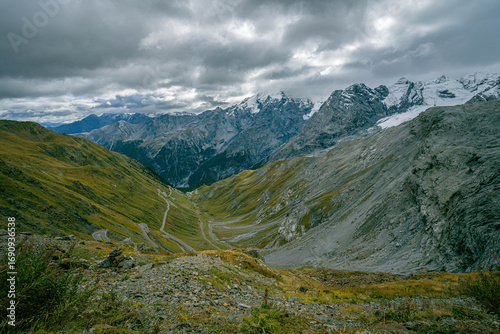 Fototapeta premium Panoramic view of Stelvio Pass mountain pass with legendary hairpin bends...