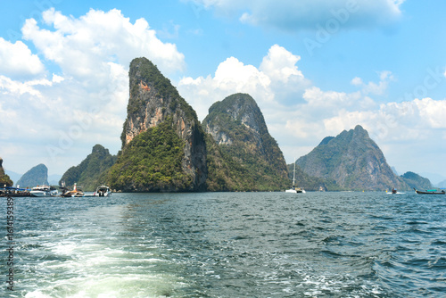 © HB, Fototapeta premium Panoramic view of stunning Phang Nga Bay with limestone karsts rises from tropical waters and a sailboat.
