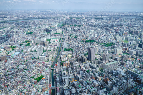 © Samuel Ponce, Obraz premium Panoramic view of sunny Tokyo from Tokyo Skytree Tower Observation Deck, Japan