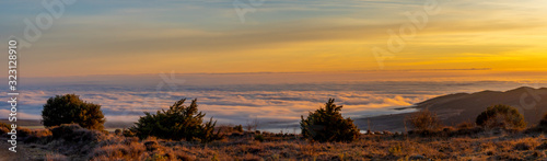 © JuanFrancisco, Obraz premium panoramic view of sunrise over the clouds on the mountain.