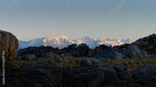 Fototapeta premium panoramic view of sunset in the mountains. Lofoten Islands, Norway.