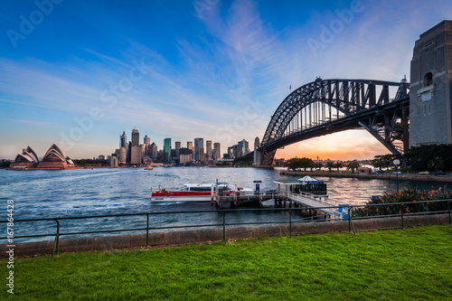 © Daniela Photography, Naklejka premium Panoramic view of Sydney Harbour at sunset with the two icons, the Sydney Harbour Bridge and Opera House from North Sydney in Australia
