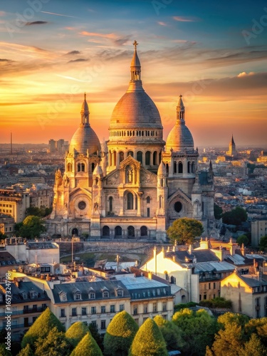 © Watcharapon, Naklejka premium Panoramic view of the Basilica of the Sacred Heart of Paris at sunset