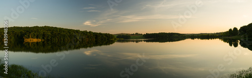 © daphnusia, Obraz premium Panoramic view of the calm lake at sunset. High resolution nature background image