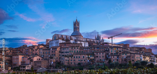 Fototapeta premium Panoramic view of the cathedral of Siena at sunset, Italy, pink