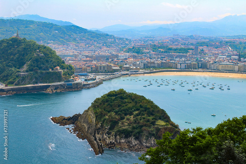 Fototapeta premium Panoramic view of the city, ocean and sand beach on the summer day. San Sebastian. Spain.