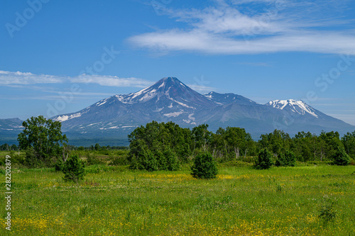 Fototapeta premium Panoramic view of the city Petropavlovsk-Kamchatsky and volcanoes: Koryaksky...