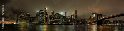 Fototapeta premium Panoramic view of the Downtown Manhattan and Brooklyn Bridge during a foggy night. Taken in New York, NY, United States.