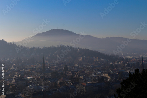 © Jakobs Studio, Obraz premium Panoramic view of the foggy city of Freiburg with snow-capped mountain peaks in the background on a winter day