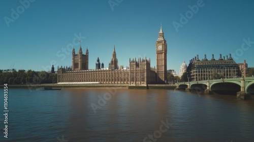 © Wiryo, Naklejka premium Panoramic view of the Houses of Parliament and Big Ben in London, UK, on a sunny day, with the Thames River in the foreground and a bridge to the right.