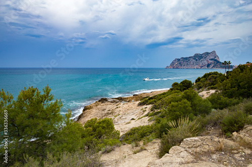Fototapeta premium Panoramic view of the Ifach Rock Natural Park or Penon de Ifach in the city...