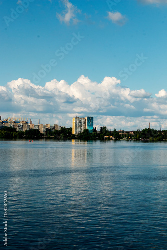 © Serge, Naklejka premium Panoramic view of the left bank of the Dnieper River. Ukraine. The city of Dnieper. Reflection of the sky with clouds on water surface.