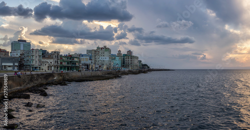 © edb3_16, Naklejka premium Panoramic view of the Old Havana City, Capital of Cuba, by the ocean coast during a dramatic cloudy sunset.