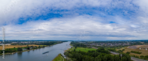 Fototapeta premium Panoramic view of the Rhine river near Leverkusen, Germany. Drone photography