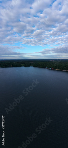 Fototapeta premium panoramic view of the river with floating boats and beautiful clouds shot from a drone