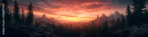 © cynz, Fototapeta premium Panoramic view of the sandstone pillars glowing under fiery sunset hues, with dense forests and soft clouds adding depth, in 4K resolution