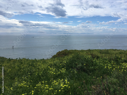 © Jack, Fototapeta premium Panoramic view of the Santa Barbara coast with a clouds coming over the ocean from Santa Cruz island in the distance on a day in March