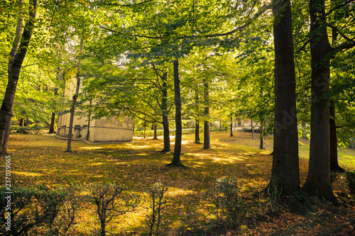 Naklejka premium Panoramic view of the seventeenth-century baroque chapels, dedicated to the life of St. Francis of Assisi, in the park of the Orta sanctuary on Lake Orta in Piedmont, Italy.