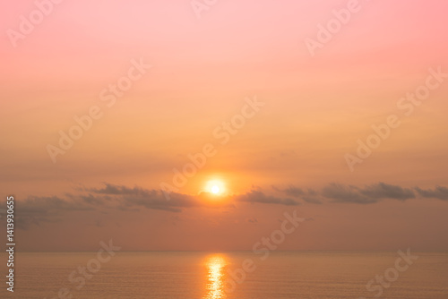 © Photo Sesaon, Fototapeta premium Panoramic view of the skyline and sea . The sun rises in the morning sky with colorful clouds. and beautiful cloud patterns In the soft light of the morning