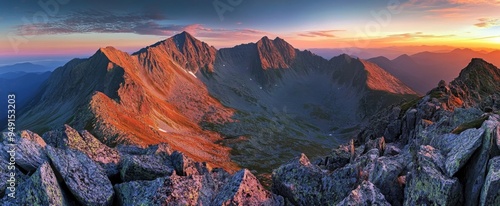 Obraz premium Panoramic view of the Tatra Mountains at sunset, showcasing rugged peaks,...