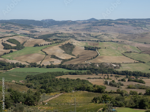 Naklejka premium Panoramic view of the Val d'Orcia countryside from Vignoni Alto, medieval...