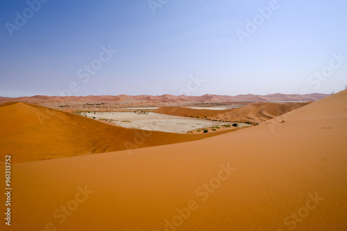 Fototapeta premium Panoramic view of the vast sand dunes and dry clay pans of Sossusvlei,...