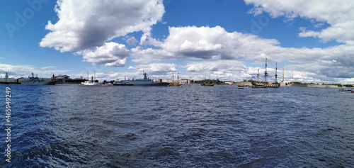 Naklejka premium Panoramic view of the warships, frigates and sailboats built in the Neva water area for the Day of the Navy in St. Petersburg.