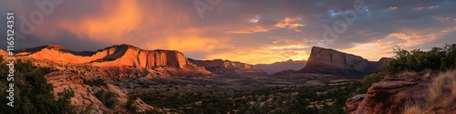 © cynz, Naklejka premium Panoramic view of The Wave s sandstone formations glowing under fiery sunset hues, with rugged cliffs and desert vegetation creating a cinematic backdrop, in 4K resolution