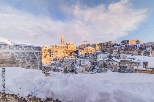© donfiore, Obraz premium panoramic view of typical stones Sassi di Matera and church of Matera 2019 under blue sky with clouds and snow on the house, concept of travel and christmas holiday,capital of europe culture 2019