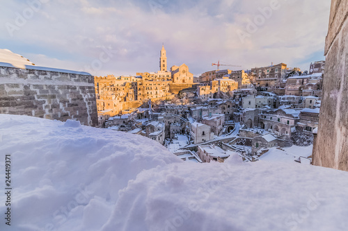 © donfiore, Obraz premium panoramic view of typical stones Sassi di Matera and church of Matera 2019 under blue sky with clouds and snow on the house, concept of travel and christmas holiday,capital of europe culture 2019