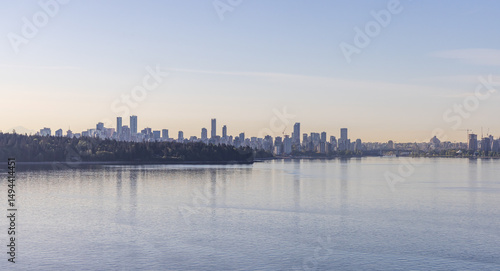 Fototapeta premium Panoramic View of Vancouver Skyline in BC with Water Reflecting Morning Light