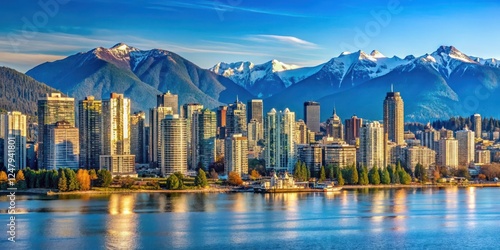 Obraz premium Panoramic view of Vancouver skyline with skyscrapers, mountains, water,...