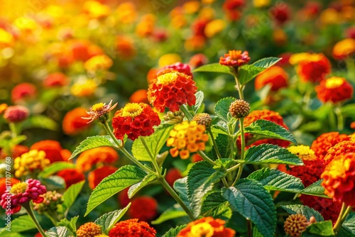 Obraz premium Panoramic View of Vibrant Red, Orange, and Yellow Lantana Flowers in Full Bloom