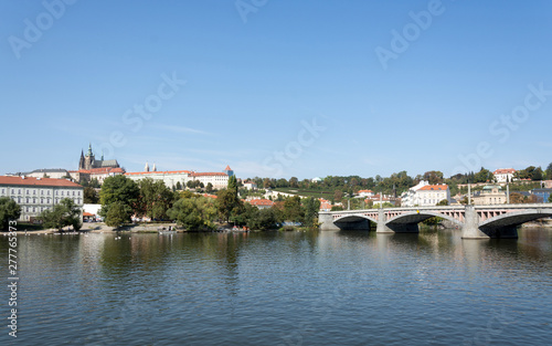 Fototapeta premium Panoramic view of Vltava river, Prague castle, and colorful rooftops of New Town on a bright summer day, in Prague, Czech Republic