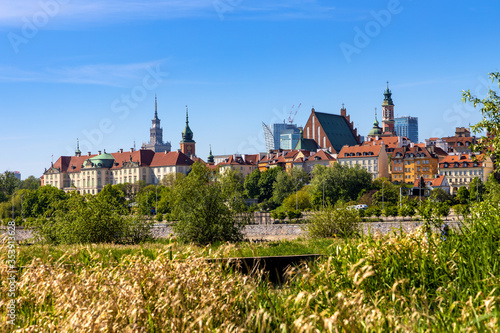 Fototapeta premium Panoramic view of Warsaw, Poland, city center and Old Town quarter with Wybrzerze Gdanskie embankment and wild banks of Vistula river