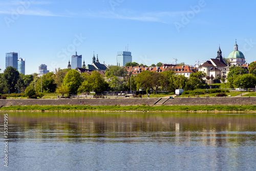 Obraz premium Panoramic view of Warsaw, Poland, city center and Old Town quarter with Wybrzerze Gdanskie embankment at Vistula river