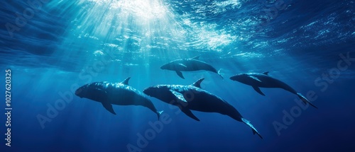 Fototapeta premium Panoramic view of whale pod in endless blue ocean