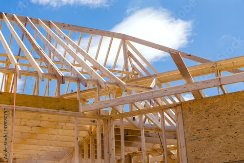 Obraz premium Panoramic view of wooden frame house under construction, roof beams